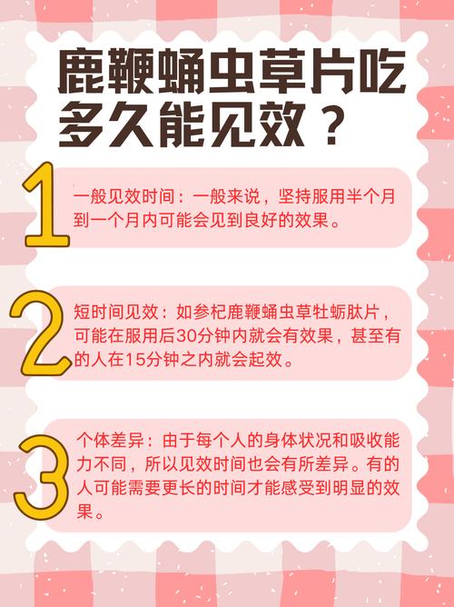 2、虫草鹿鞭王的效果与个人体质紧密相关,一般而言,它能够维持1-2个小时的显著效果。只要遵循正确的服用方法,即可实现理想的性功能提升效果。建议在性生活前半小时左右服用,这有助于增强男性的性功能,并提升精子质量,从而增加怀孕的可能性。虫草鹿鞭王的核心成分包括人参、锁阳等具有壮阳功效的中药。